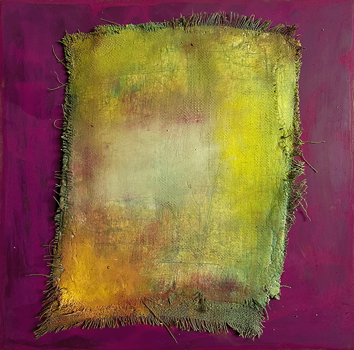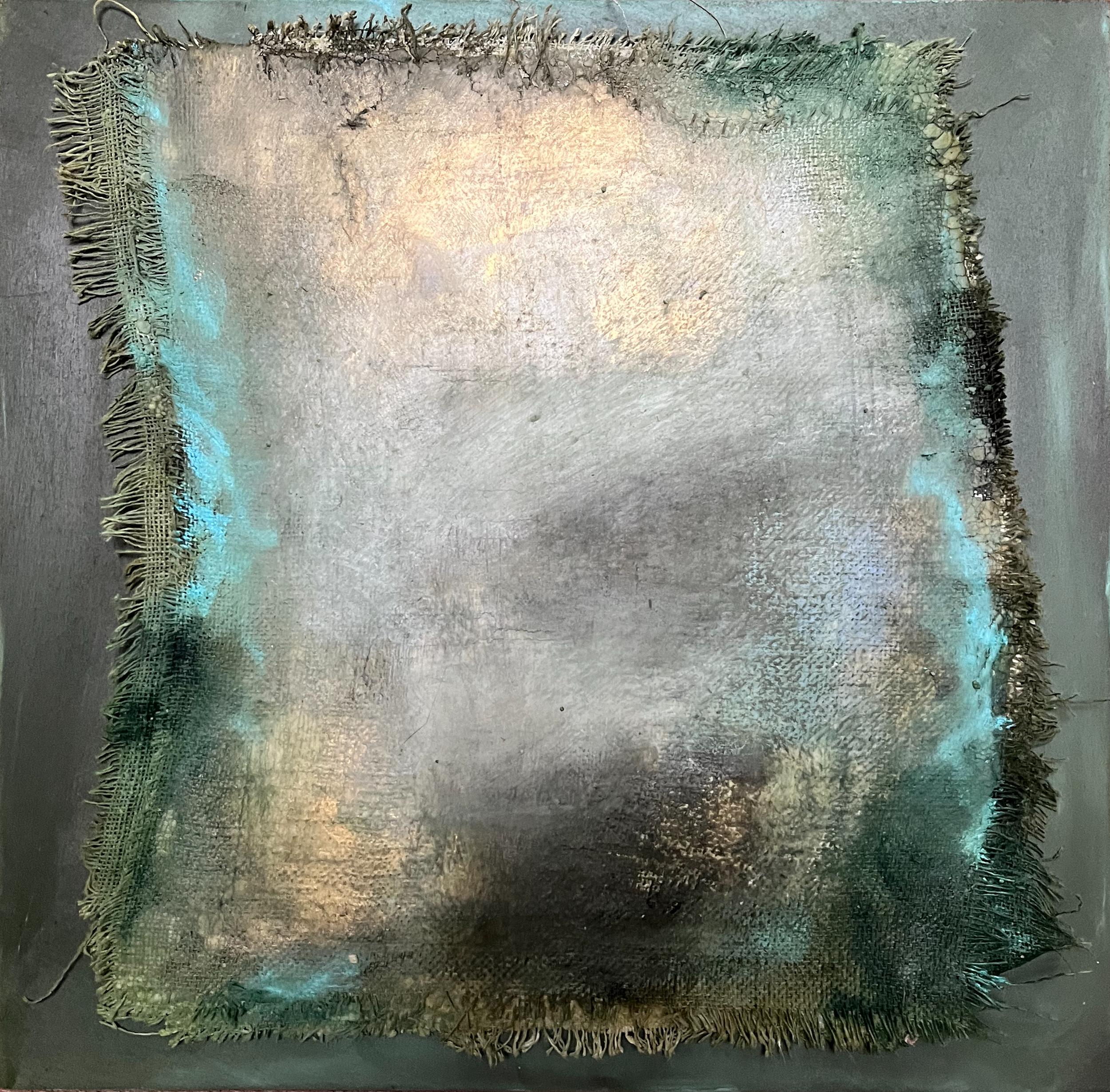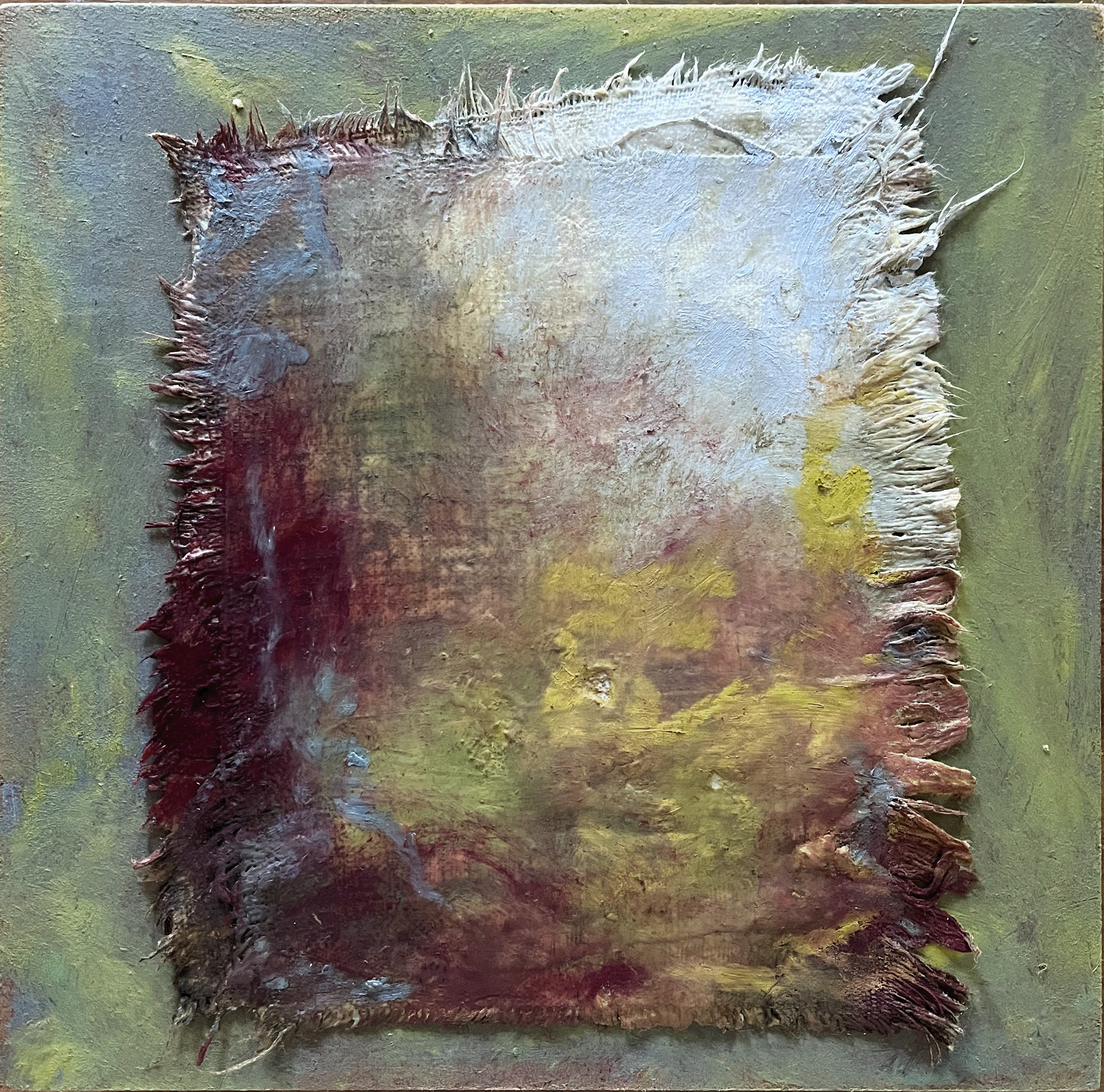 Oil, craypas, linen and plaster on masonite.