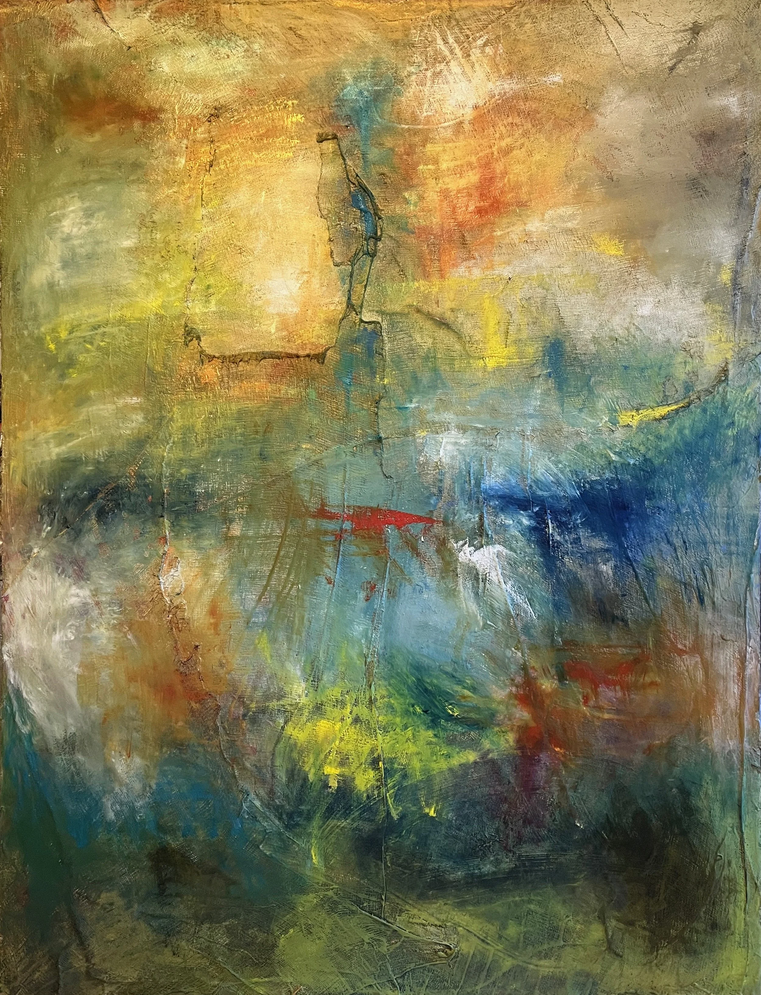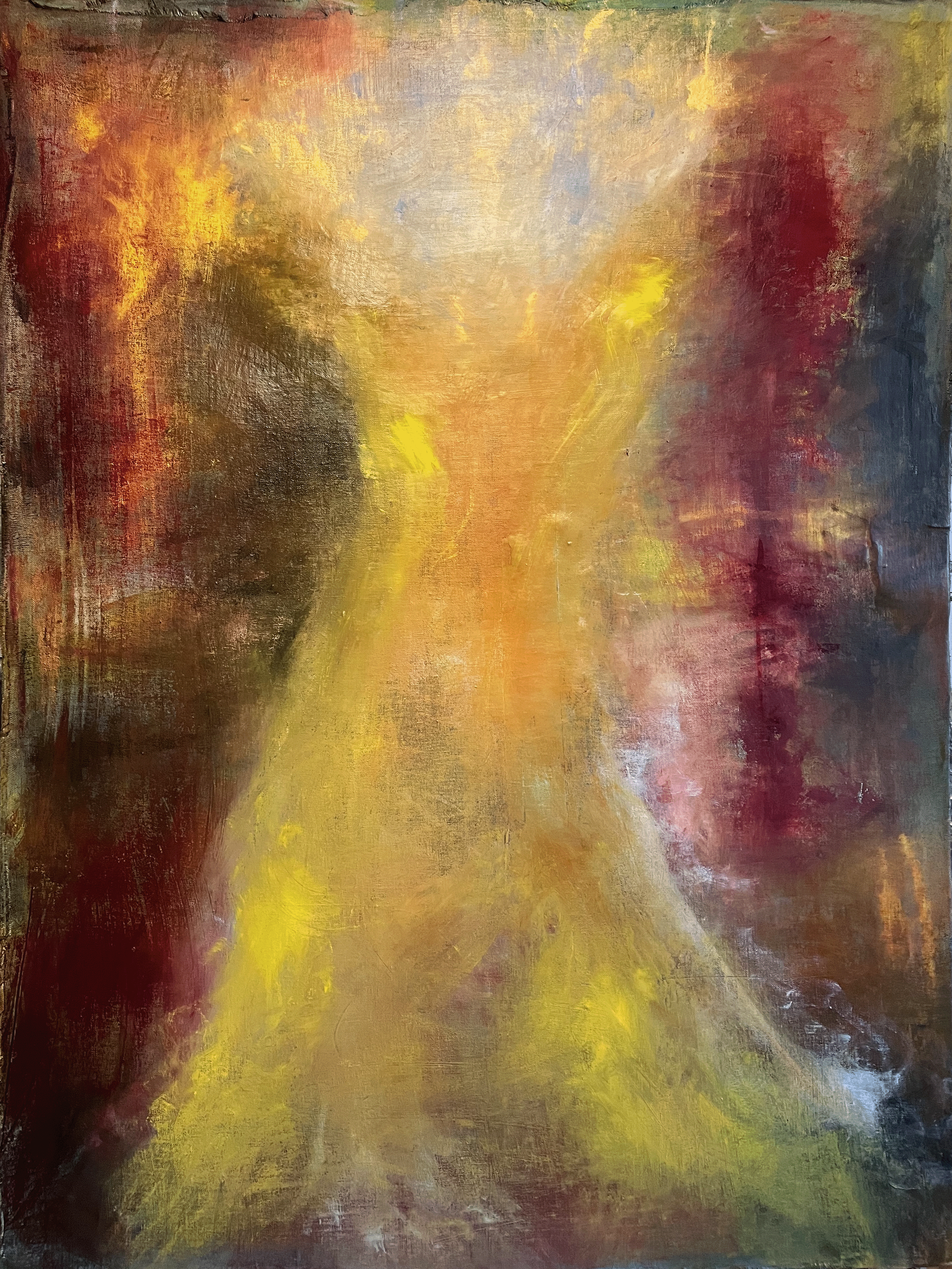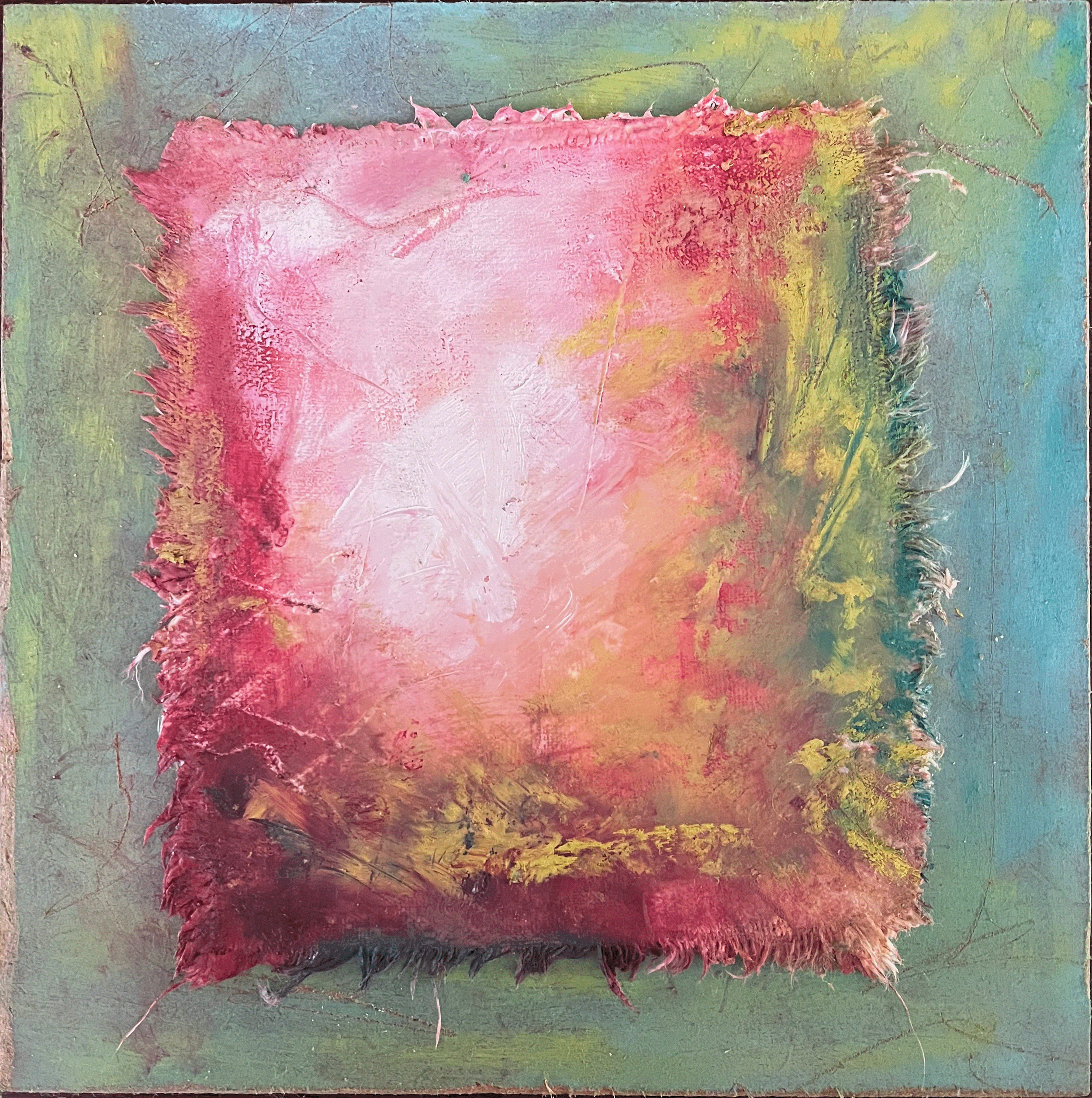 Oil, craypas, linen and plaster on masonite.