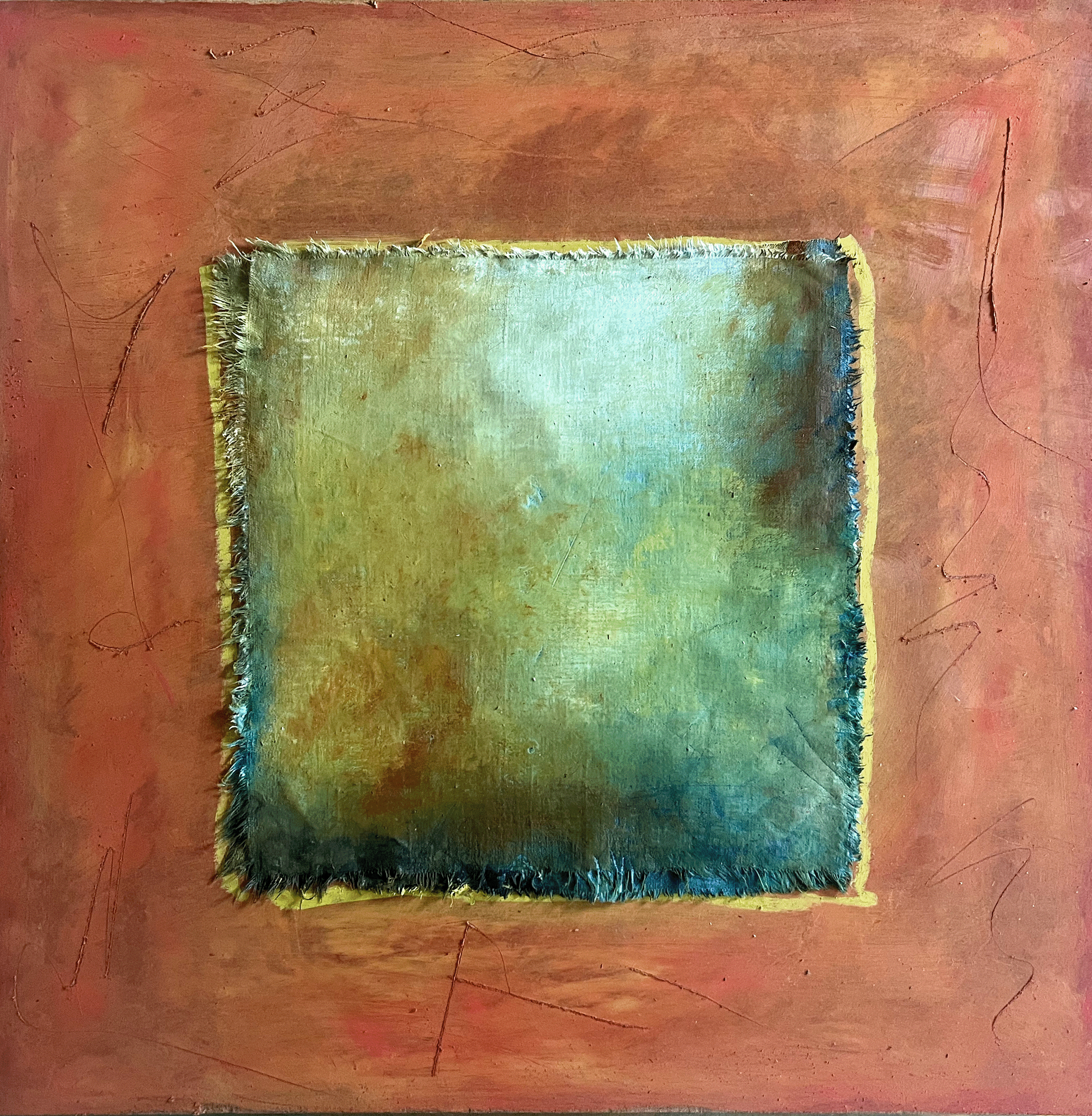 24 “ x 24” Oil, Craypas, Linen and Plaster on Masonite