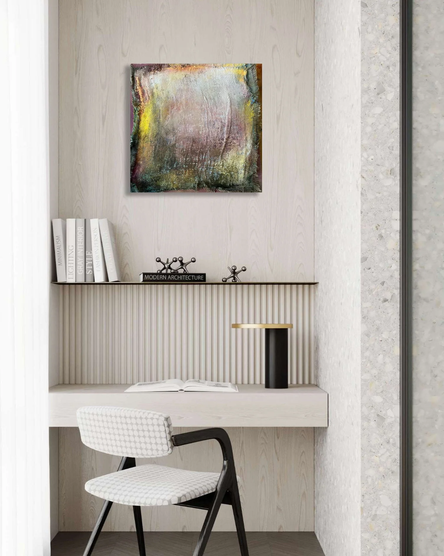 Painted in 2024 and created as a gift to my analyst after 35 years of working together. The ripped edges and multitude of color are representative of the years of analysis and the journey we took together. Colors range from warm tones of yellow and gold to cooler shades of blue and purple, representative of the different emotional landscape we traversed. The areas of dark brown and black, which create a sense of depth and contrast signify the harder, less comfortable aspects of our work. The texture of the canvas is visible, with brushstrokes and layers of paint creating a rough, almost tactile surface. The overall impression is one of energy and movement, which captures the journey of discovery and growth we took together.