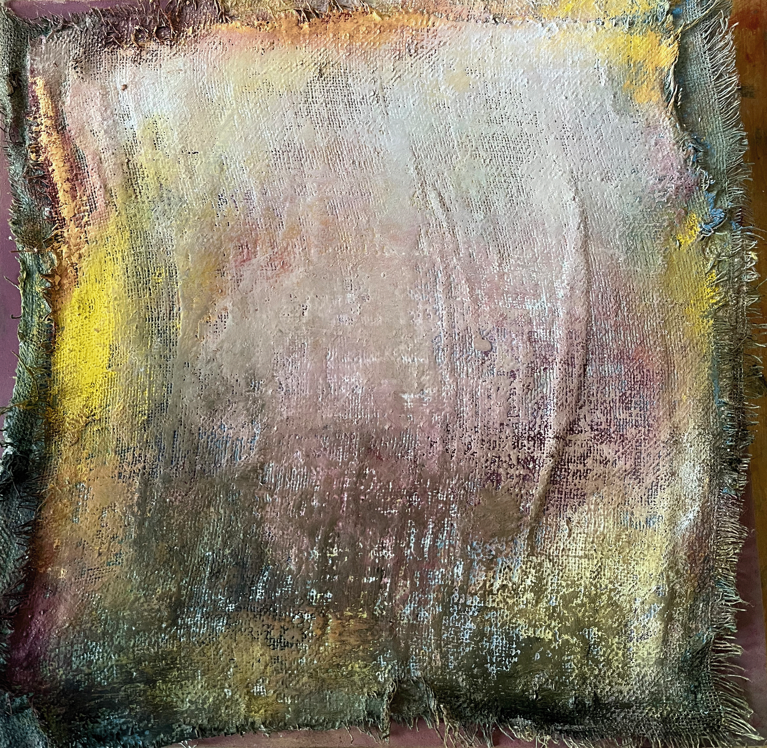 12 “ x 12” Oil, Craypas, Linen and Plaster on Masonite